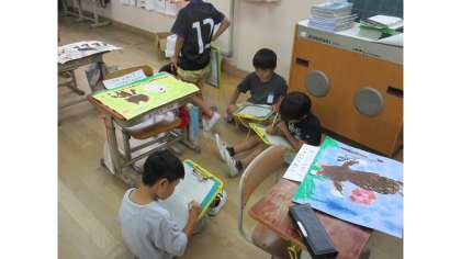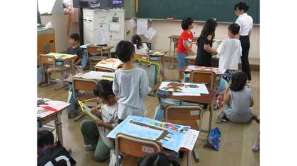 「おはなしから うまれたよ」の単元では、お話から想像したことを絵に表しました。一人ひとり工夫いっぱいの作品に仕上がりました。今日は、友だちの作品の「いいところ」をみつける鑑賞をしました。