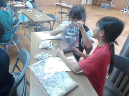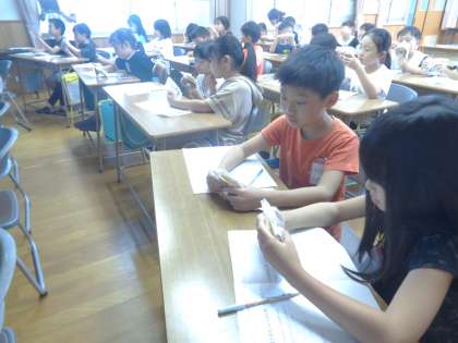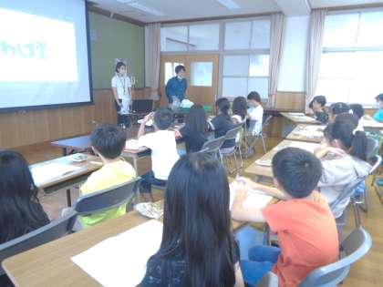 ゲストティーチャーとして、あわしま堂の方が来てくださいました。子どもたちが、学習の中で調べたり予想したりしてきたことを確認することができました。おいしい和菓子をつくるために工夫されていることやどら焼きの製造過程を動画や写真をもとに解説しながら教えていただきました。原材料を調べるために一人一人に用意していただいたどら焼きを嬉しそうに持ち帰りました。次の時間には、教えていただいたことをまとめていきます。