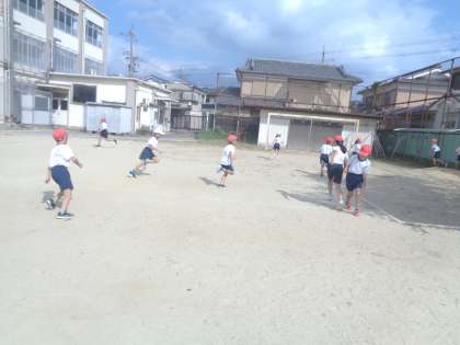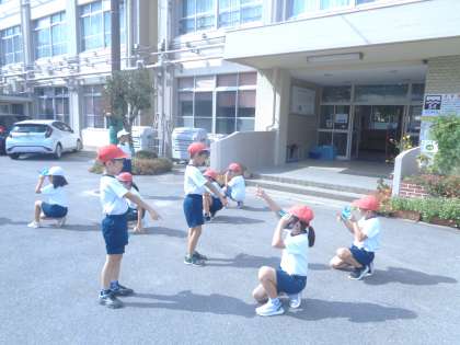 「地面の様子と太陽」今日は、影ができる位置と太陽の位置を確かめました。遮光坂を使って見える太陽に歓声が上がっていました。