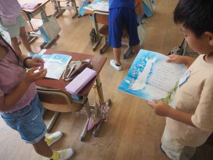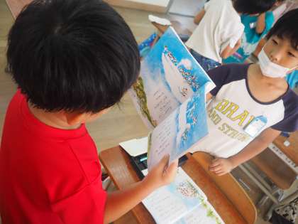 国語科では『くじらぐも』の学習をしています。自分の好きな場面を音読して、どうして好きなのか理由を伝え合いました。