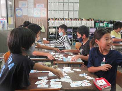 外国語の学習では、小文字や大文字のアルファベットのカードがどこにあるのかを探して楽しみました。先生の話をよく聞いて、先生が伝えたアルファベットのカードを素早く取ることができました。友だちとの勝負を楽しみました。