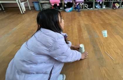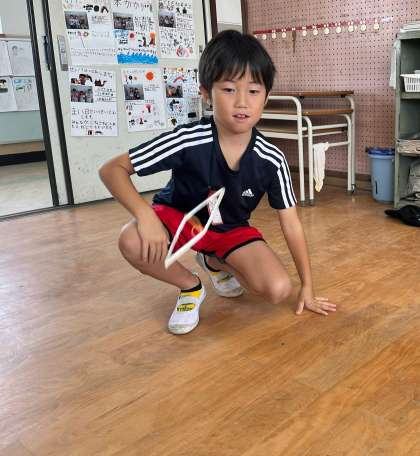 「輪ゴムを使ったら跳んだよ。」「もっと高く跳ばすためにはどうしたらいいかな〜?」「あそんで ためして くふうして」作ることができました。