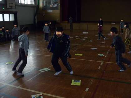 飼育委員会の子どもたちが,かるた大会を開いてくれました。ウサギのことや畑のことなど,飼育委員会の仕事に関係のあることが大きなかるたになっています。子どもたちは広い体育館で走り回ってかるたをとりました。