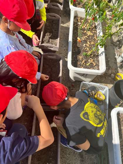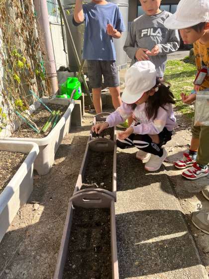 生活科の学習で、はつか大根の苗を植えました。これまでにもいろいろな野菜を育ててきました。約20日で育つ大根が楽しみです。