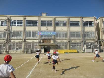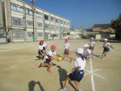 体育では、「陣取りゲーム」の学習を進めています。陣取りゲームのボールは、丸いボールではなく、楕円形のボールなので、しっかりボールを持たないと落としてしまします。ボールを落とさないようにしっかり持ち、トライするゴールに向けて一生懸命走っています。