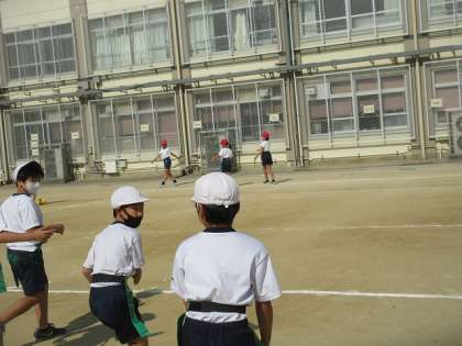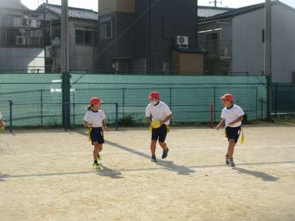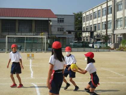 つながりを意識するために、横一列に並び、パスの練習をしました。つないでパスをする難しさを感じることができました。子どもたちは、何度も何度も挑戦しました。