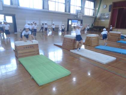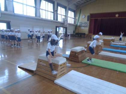「跳び箱」の学習をしています。縦横の開脚跳び、台上前転、横のかかえ込みとび・・など自分の「めあて」に沿って活動しています。