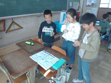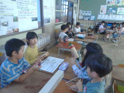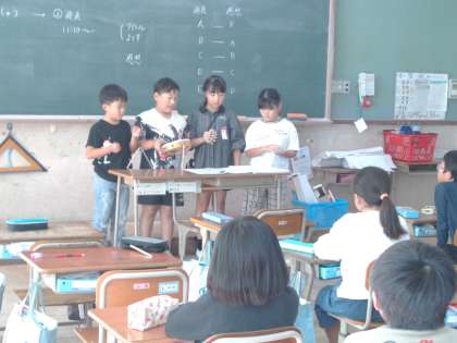 「クロックミュージックを聞き合おう」グループの友だちとテーマを決めて選んだ楽器の組み合わせやリズムを考えて曲を作りました。発表したグループに感想を伝えていました。