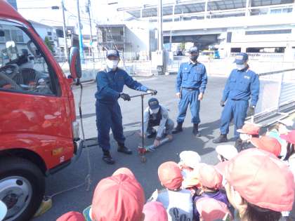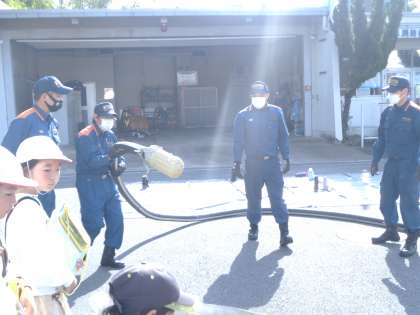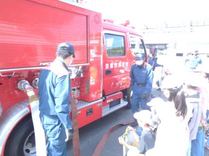 消防車の仕組みについて、教えていただいています。消火栓から水を取ることは分かっていた子どもたちですが、消防車から放水するまでを疑問としていました。道路に消火栓があるとして消防車にいったん水がためられ、車につないだホースから放水する仕組みや、川やプールから水を取るときのホースや仕組みも教えていただきました。