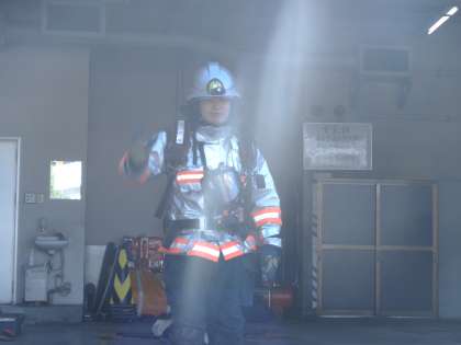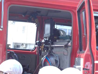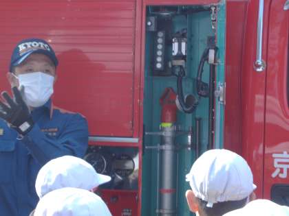 熱い火の中に入るときの防火服に一瞬にして着替え、ブーツ・ヘルメット・酸素ボンベの装着など大きな声で確認しながら準備される姿に驚いていました。消防車には消防指令センターからの連絡をやり取りできる無線機や消火栓の場所が記されているナビゲーターもあることを知りました。お忙しい勤務時間を割いて、子どもたちの学習のために本当に詳しく,わかりやすく教えていたたきました。淀消防出張所の皆様に感謝の気持ちでいっぱいです。