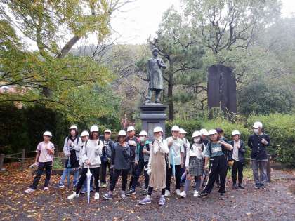 琵琶湖疏水工事の設計に携わった田辺朔郎の銅像前に到着しました。右手には意味のあるものを持っていました。子どもたちは、設計図かなと予想していました。