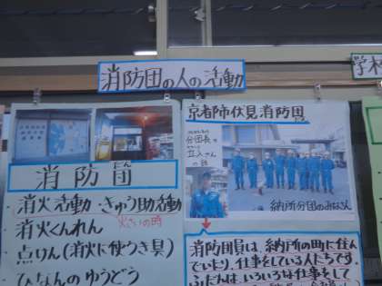 「安全なくらしを守る」の学習も終盤になりました。子どもたちは、消防団について調べました。活動の中で、京都市伏見消防団納所分団の分団長さんに消防団の活動や思いを教えていただくビデオメッセージをいただいたり、防災訓練の様子を撮らせていただいたりしました。「自分の町は、自分たちで守る」という思いが、子どもたちの心に響きました。地域のみな様に支えられて学習活動ができていることに感謝の気持ちでいっぱいになります。