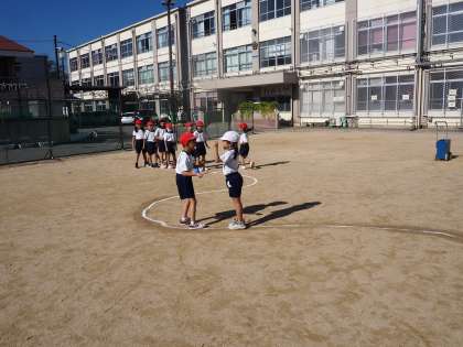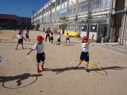 じんとりあそびとようぐあそびの学習をしています。じんとりあそびでは、曲線のコースをじゃんけんして進みました。ようぐあそびでは、フラフープを回したりなわとびのようにとんだりして楽しみました。