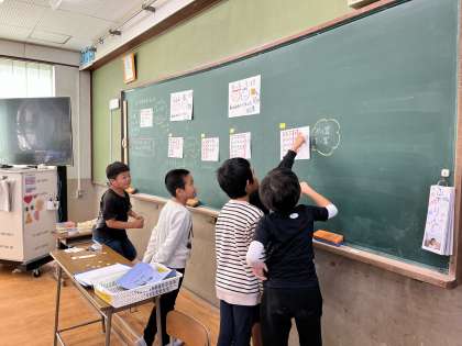 算数科『かけ算(2)』の学習で、箱の中にあるチョコレートの数をまとまりを使って考える学習をしました。「かけ算とたし算を使うとできるよ。」「かけ算とひき算でもできた!」といろいろな考え方が出てきました。友達の考え方についてみんなで話し合い、興味津々の様子でした。