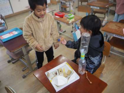 どんぐりやまつぼっくりを使ってつくったおもちゃで遊びました。お店屋さんとお客さんに分かれて楽しく遊ぶことができました。
