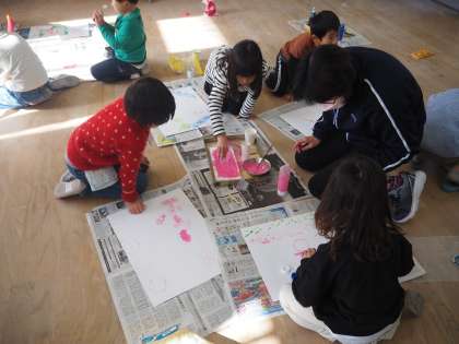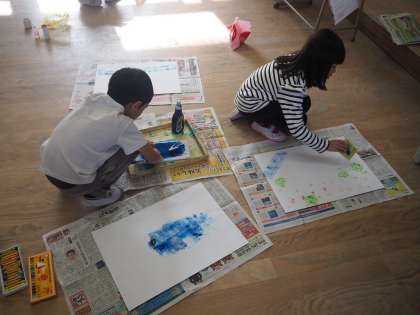 カップや洗濯ばさみなど、いろいろな形をうつして思い思いの作品を表現しました。海の世界や動物の世界など、できた形から想像をふくらませていました。