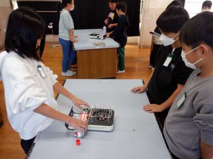 理科の実験を理科室で行うので、理科室の使い方や、実験の際に気をつけることを学習しました。カセットコンロを安全に使うことができるように、つけ外しや点火の練習もしました。