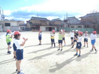 体育の学習前に長なわとびで体を温め、その後にしっかり準備運動をしています。[1.2.3,4,]と、とても元気な声が響いていました。