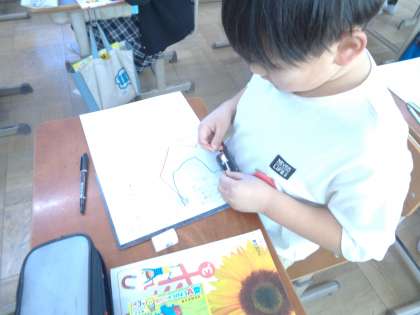 「電気の通り道」前時で立てた学習問題「乾電池と豆電球を導線でどのようにつなぐと、明かりがつくのだろうか。」について予想を立てた後実践をしています。+極と−極に導線をつなぐと明かりがつくことが分かりました。また、明かりがつかない場合も試してみました。