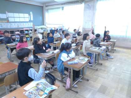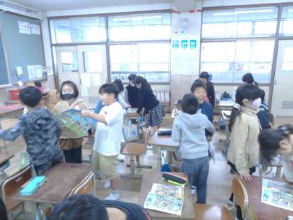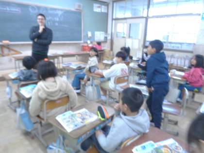 今日は、ALTの先生と一緒に学習をしました。子どもたちは、先生の発音をリピートしたり身の回りにある物の名前を確認したりする活動を楽しみました。