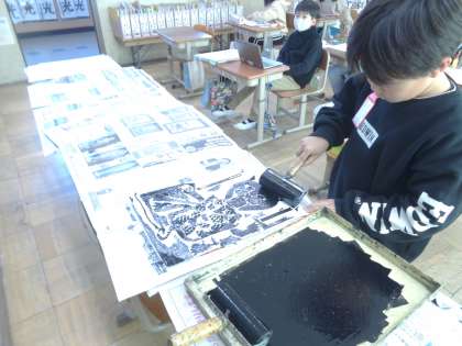 紙版画「いろいろうつして」の学習も進んできました。時間をかけて作った台紙にインクをつけて刷っています。紙をめくった時には「おおー!」「すごーい!」と初めての版画に感動していました。