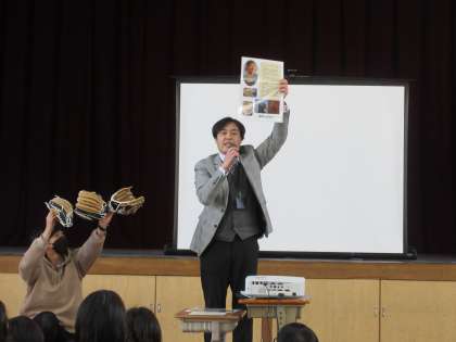 教頭先生より、大谷翔平選手から届いたグローブと京都ハンナリーズから届いたバスケットボールの紹介がありました。子どもたちは、グローブやバスケットボールを使えるのを楽しみにしている様子でした。