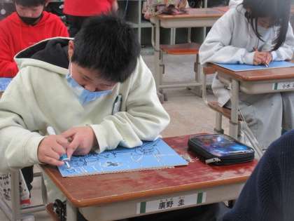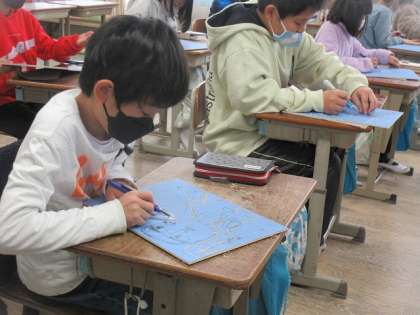 彫る力の加減や彫る角度、彫る長さなど、色々なことを考えながら彫りました。子どもたちは、力の加減などをしっかり考えて彫り、彫りすぎず、彫らなさすぎず、適度な彫りあとを残すことができていました。