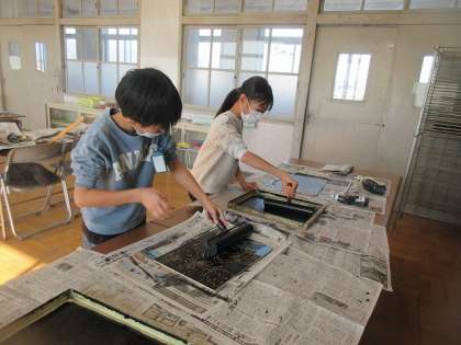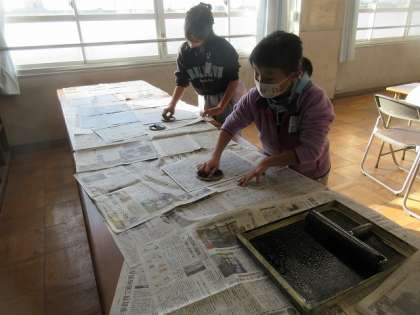 今まで時間をかけて彫ってきた板に黒のインクを塗りました。塗っていないところがないように、ローラーを縦や横に向きを変えて力の加減を考えて均等に塗りました。色を塗った後は、版画用の半紙にバレンで円を描くように擦り、半紙に馴染ませて完成です。子どもたちは、最後まで集中して版画を仕上げることができました。