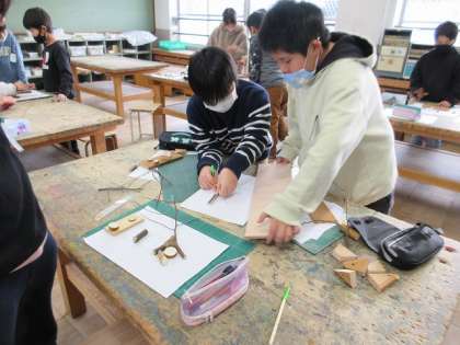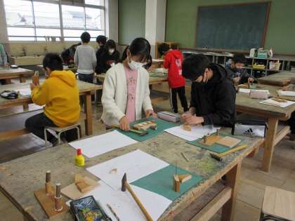 図画工作展に向けて、図画工作では、「ギコギコトントンクリエイター」の学習で、のこぎりや金づちなどを使ってオリジナルの額や生活で使う飾りなどを作っています。子どもたちは、安全に気を付けて進めることができました。