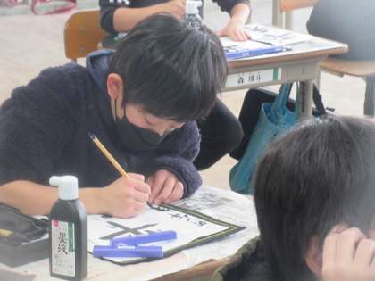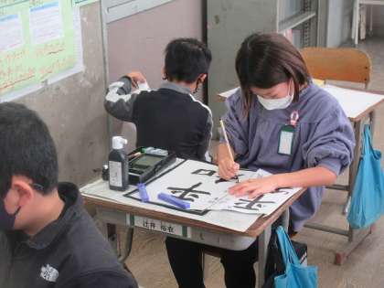 書写では、これからも平和な社会を願って「平和」の言葉をかきました。今まで学習したことをふりかえりながら、とめはねはらいなどに気を付けてかきました。