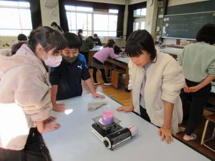 「もののあたたまり方」の実験では、水の温まり方の実験をしました。鉄のあたたまり方と違う結果だったので、子どもたちは驚いていました。