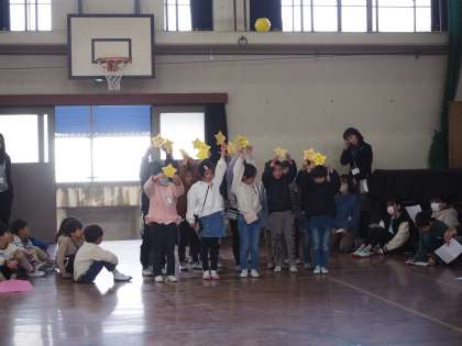 今日のきずな集会では、学級目標のふりかえりを発表しました。この1年間でいろいろなことができるようになった1年生。元気いっぱい、堂々と発表することができました。