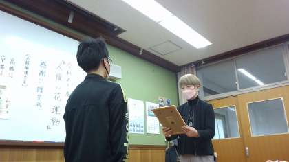3月4日(月)、3・4組さんと5年生が取り組んできた「人権の花運動」の感謝状贈呈式がありました。人権擁護委員のみなさんから、みんな能登陸に対する感謝状や記念品をいただきました。