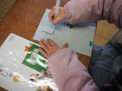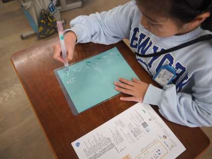水書用紙を使って、初めて筆を使った学習をしました。鉛筆とは違う書き方に戸惑いながらも、姿勢や持ち方に気をつけて書くことができました。