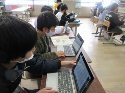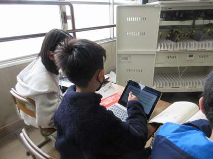 国語科の「調べて話そう、生活調査隊」の学習では、クラスの友だちに生活についてのアンケートをしてもらい、そのアンケートの結果をもとに班のグループでしっかり話し合いながら発表する準備をしています。