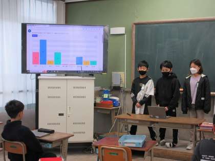 寝る時間のことや休みの日の過ごし方など、とても気になるアンケートの発表がありました。また、発表した人に対して、質問や感想を伝え合いました。