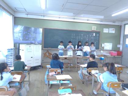 「春のうた」冬眠から目覚めたカエルが地上に出てきた時の気持ちが伝わるように音読をしました。友だちの読み方のいいとこをも見つけることができました。