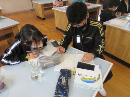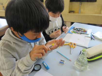 理科の学習が本格的にスタートしました。今日は、アブラナの花はどのようなつくりをしているのか、調べました。細かいところまで観察する姿は研究者のようでした。