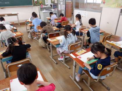 図画工作でクレヨン画をかきました。「おひさま」と、自分の好きなものを、かたちや色を考えながらかきました。みんなの好きなものがたくさん分かりました。