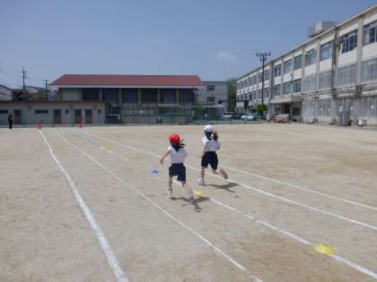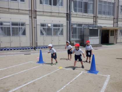 「いちについて」「ようい」のやり方をしっかり覚えて、スタートの合図で力いっぱい走りました。全力で走って気持ちよさそうな笑顔でした!