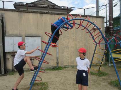 遊具に登り、どこまで行けるかな?