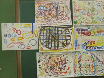色とりどりの模様がたくさん!とてもすてきですね。「ここがすてきだね。」「こんな色どうやって作ったの?」などと話しながら、みんなで見合いました。