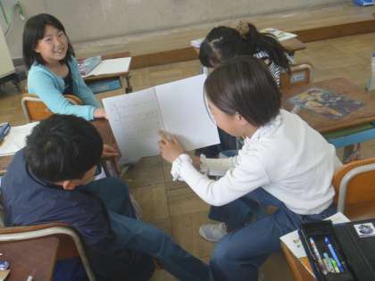 自分の考えを友達に伝えているところです。わかりやすく説明するために、ノートを持って説明をしたり、指をさしたりしながら工夫しています。