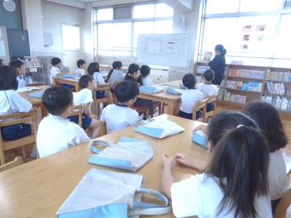 「図書館の達人になろう」今年度初めて図書館に行きました。今日は、図書館司書の先生に図書館の本の分類やラベルの見方を教えていただきました。子どもたちが待ちに待った学級図書と個人貸出をしていただき嬉しそうでした。