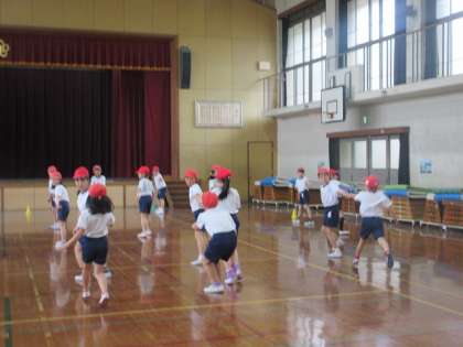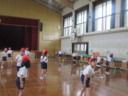 今日の体育の「リレー」の学習は、運動場の地面の状態が悪く、体育館で行いました。スムーズにバトンパスをするには、何が大切か考えながらバトンパスを行いました。グループでしっかり声をかけ合いながらバトンパスをしている姿がよかったです。