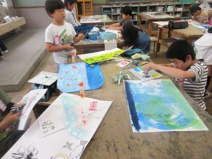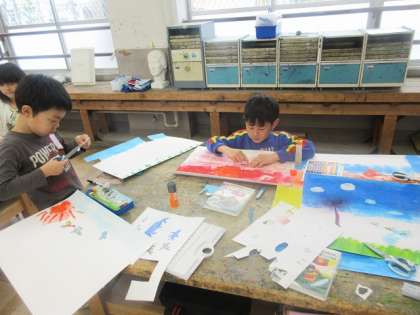 「絵の具でゆめもよう」では、海や山や夜空や夕焼け、花火など、自分のテーマを決めて、学習を進めています。紙を切り貼りしたり、絵の具を使って模様をつけたりして工夫しています。