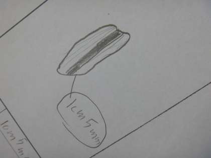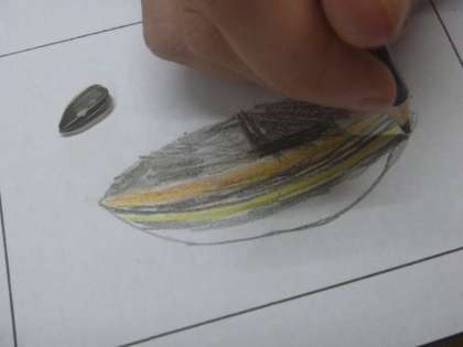 上手にまとめています。目でみたときに一色に見えたものが、虫めがねで見ると・・・「色が混ざっている!」「筋が入っている!」などと、たくさんの発見があったようです。