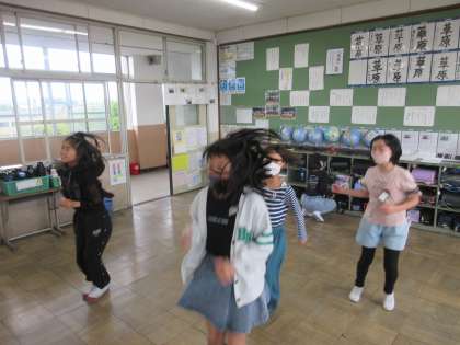 今年度より始まった朝の健康チャレンジで流しているダンスを昼休みに練習しています。曲は「あいうえ音楽」です。みんな楽しく踊っていました。