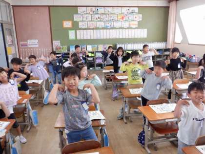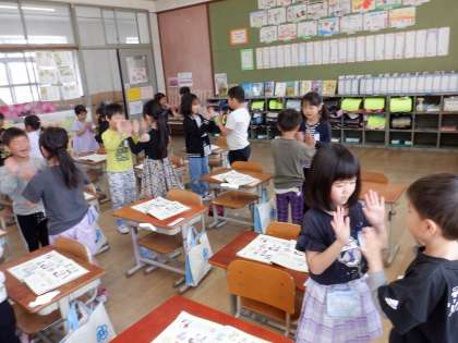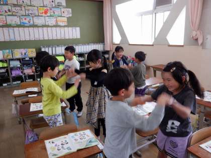 音楽の学習で「セブンステップス」を歌ったり、リズムに合わせて手をたたいたりしました。友だちと一緒に手遊びもしました。「チェッチェッコリ」では、踊っているうちに曲がだんだん速くなるので、大盛り上がりでした。