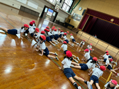今、子どもたちは「進化ジャンケン」にはまっています。様々な生き物に進化しながら体を操作する力を伸ばしていきます。今日のスタートは「アシカ」様々な進化を遂げ、人間まで進化することはできるのか!?明日の体育でもやる予定です。どんな進化をたどるのか、また聞いてみてください。